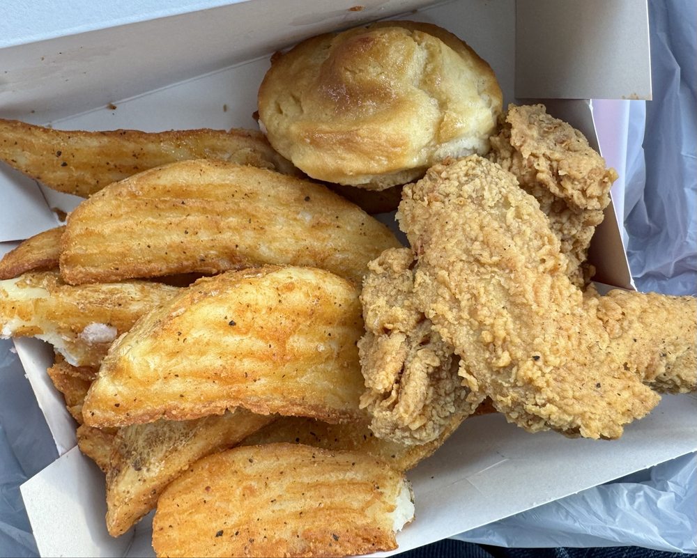 12 Piece Chicken Mix, 6 Piece Cajun Tenders, 6 Biscuits & Potato Wedges. (6650 Cal.) *Halal*